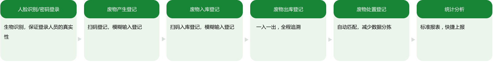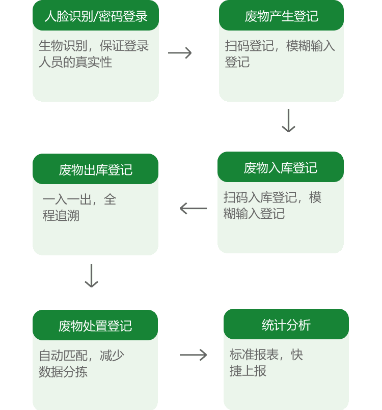 可实现从产废设备、产废流转、产废贮存、产废处置的完整记录,满足法规要求